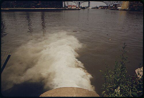 A city pump station discharges sewage into Cuyahoga River in 1973